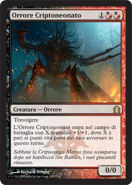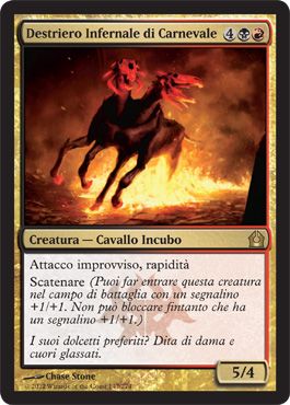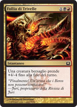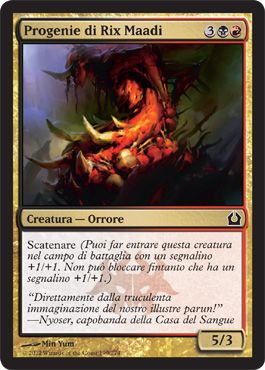 In limited acquista una notevole potenza e forza. Se siamo sotto la possiamo giocare normalmente, come un 5/4 con rapidità e attacco improvviso (che non si butta mai) o un 6/5 con rapidità, attacco improvviso e che non può bloccare. Ovviamente questa scelta è da operare in base alla situazione di gioco e sicuramente questa carta quando morirà si porterà con sé molte creature dell'oppo (a meno di spari grossi). Carina, sicuramente da giocare in limited se sono Rakdos.