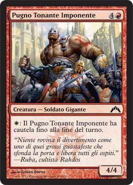 In limited è un ottimo bittante e a cc5 possiamo o rendere doppioattaccante un nostro ciccione (e quelli si che sono danni... ipotizziamo di dare doppio attacco a un Colosso di Macerie con 8 terre in campo... un 8/8 con sopra questa carta diventa un 11/11 con doppio attacco, cioé 22 danni per l'oppo) oppure calarlo come creatura. Io preferirei di più usarlo come trick in combat, ma una creatura in campo in certi casi può essere più utile. Ottima sia in boros che in gruul.